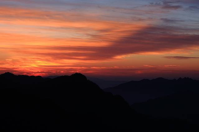 早上5:00起床,5:20出发,前往香炉山看日出。香炉山日出必须早点去,快到香炉山的时候有很长一段的盘山道,路很窄,只能过一辆车,路上也没法停车,一定要注意安全。去晚了的话就上不去了,只能在路上堵住。天亮以后,有很长一段时间,道路很拥挤,车上不去,也下不来,只能等景区工作人员疏散。如果晚了,自驾车是不让上的,只能坐景区的中巴车上去,车费听说是30元/人(只是听说,未经证实)。