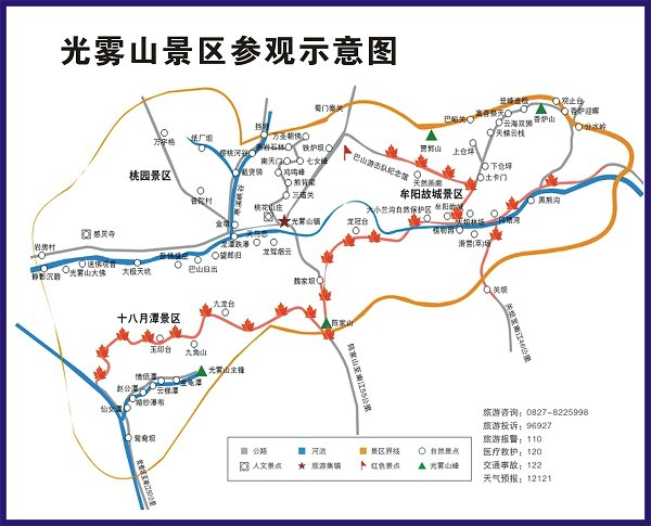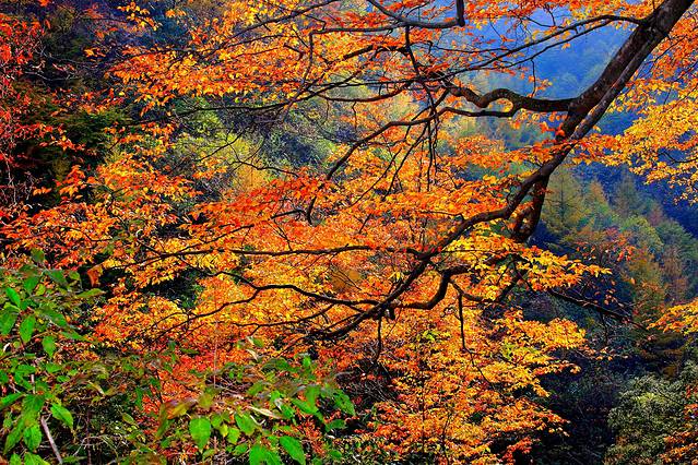 光雾山位于四川南江县北部边缘,距县城70公里,距陕西省汉中70公里,景区面积400余平方公里,气势雄伟辽阔,地形复杂,峰峦迭嶂,峰林俊美,洞穴幽深,山泉密布,云蒸雾绕,林海浩荡,胜景众多。每年的10月20号到11月初,这里层林尽染、万山红遍、五彩缤纷。它不同于别处的秋景,这里有山,有水,有彩林。应当说它是中国最好的彩林之一。迷醉在光雾山的彩林里,一步一景,让人目不暇接,心旷神怡。