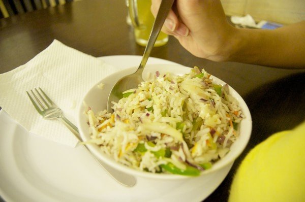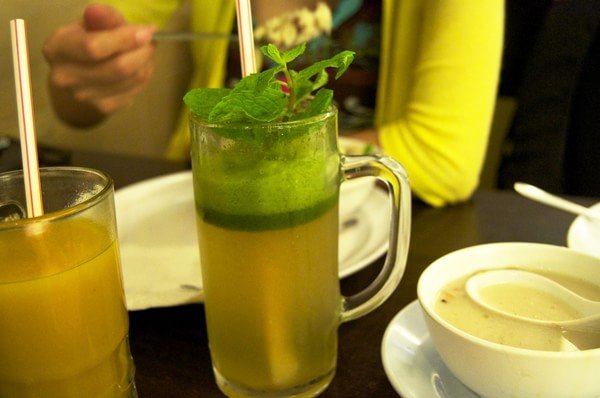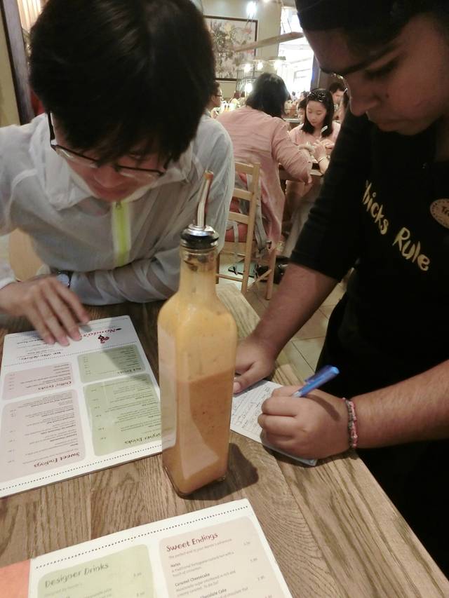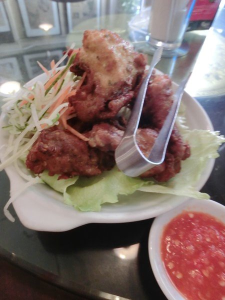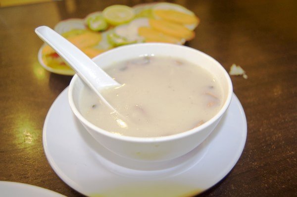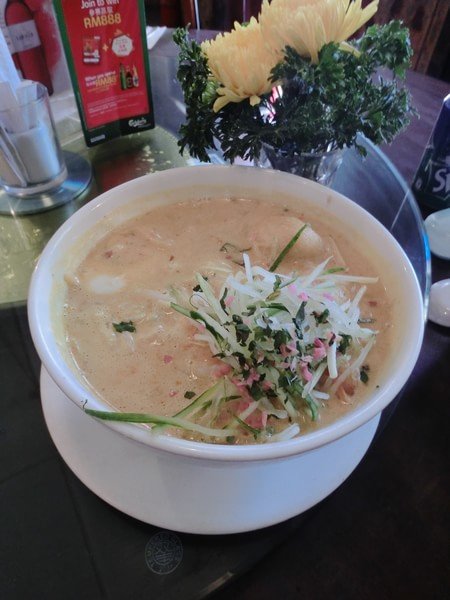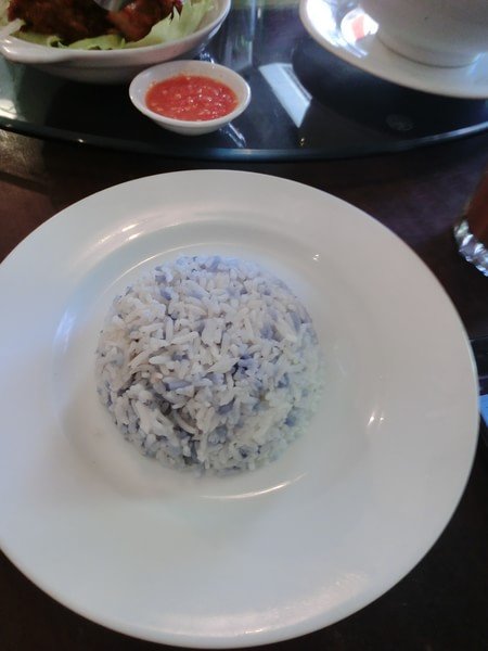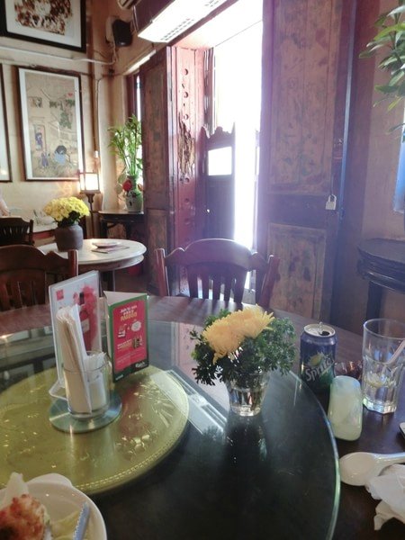 这是餐厅的大门,看上去十分的破旧,这也成了这家餐厅的一大特色,顺着这破旧的大门,我们便可以开始探索其经典菜的历史典故啦。一进餐厅,我们第一疑问就是,为什么每张桌子上都放了棚菊花?我们最终的结论是,他们可能是为了缅怀奶奶。我们点了这家餐厅相对有名的菜。其中最令我们满意的就是 nyonya lsksa (娘惹叻沙)和coconut rice(椰子米饭)。边吃老公就开始边跟我讲述这家餐厅的故事。说,以前有个老奶奶发现自己的小孙子不肯乖乖的吃饭,这令奶奶十分的担忧,于是奶奶就想办法把白白的米饭弄成了蓝色来吸引小孙子的注意,还把孙子爱吃的奶油沙拉放进汤里与蔬菜一起煮着吃。