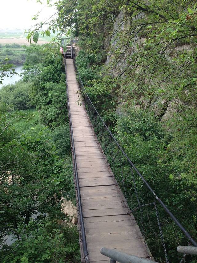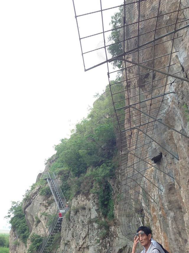 放下东西,简单在楼下周围超市买了些零食,就拿出提前制定好的“行程”,虎山长城走起了~因为住在火车站,紧挨着汽车站,所有交通非常方便,经过小巴车大概1个小时的路程(通往长城的小巴,会穿过市区,所以丹东市区也可以随便瞅一眼~),到达了位于宽甸的【虎山长城】。虎山长城去景区内有著名的‘一步跨’,相信很多到此的游客 也是为了看一下一步跨。虽没有万里长城那么雄伟壮观,但险峻程度还是值得一提的。大家可以选择从正面走石阶登顶,但大多数游客都抱着和我一样的想法,从长城后身,爬山登顶,再中转处走石阶下山。因为只有走后身,才可以看到传说中的辛勤劳作的“朝鲜人民”!过吊桥,走天梯,爬锁链,一路手脚并用,终于到达了虎山长城的最高处。终于可以一览丹东城市面貌和神秘的朝鲜国度。话说 上山容易下山难,但虎山长城真真儿上下都难啊,建议小伙伴们在满足温饱的情况下,尽量少携带物品。