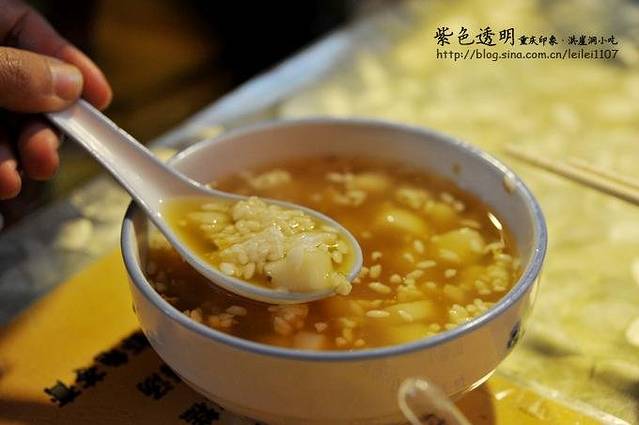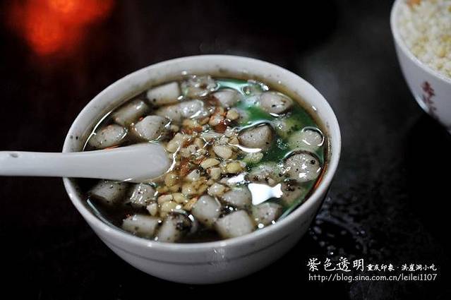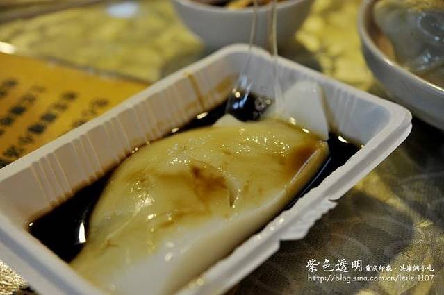 比如这个,较场口凉糕,冰冰凉凉,淋上红糖汁,味道好极了。这里是在洪崖洞一层应该,有一条小吃街,每家吃上几样,然后在转战下一家,呵呵,吃货都这样。
