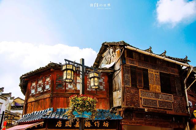 或许电线杆和略有仿古痕迹的路灯是时代进步在这里留下的一点痕迹,但是线杆上缠绕的五颜六色的电线又将时间拉回到远去的昨天。远在天边的云海却让身处山村之中的我感觉近处的风景不真实了起来。