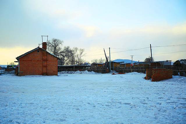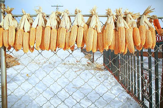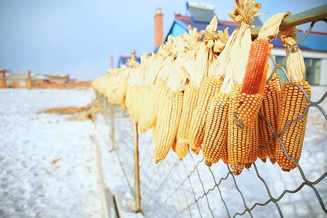 几乎家家户户都晒着玉米棒子。金黄的玉米在一片雪白的世界竟然格外地引人目光。
