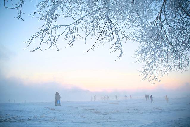 不到六点起来,就听到旅馆里闹哄哄的,有人兴奋地说今天有雾凇,而且还挺多的。