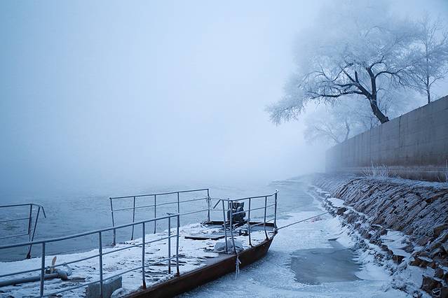 码头边上的树挂满雾凇,江面雾气弥漫,神秘至极。