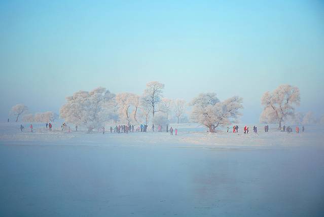 *雾凇岛:距吉林市35公里。这里的地势较吉林市区低,又有江水环抱。冷热空气在这里相交,冬季里几乎天天有雾凇,岛上又以曾通屯为欣赏雾淞的最好去处。