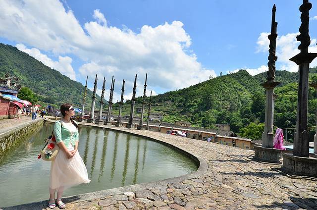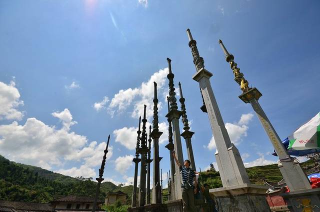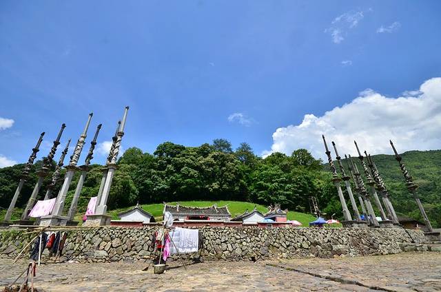 张氏家庙 德远堂前是一口半月形的池塘,池塘前边两侧石坪上耸立23支高过10米的石龙旗杆,杆柱浮雕蟠龙,腾云驾雾,势欲腾飞。