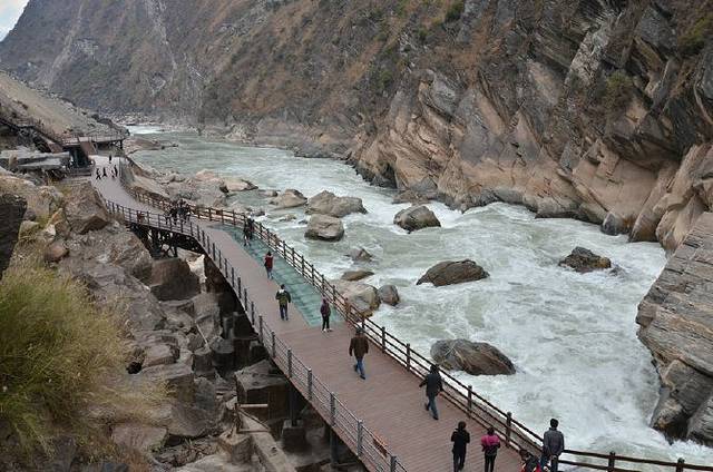虎跳峡是中国最深的峡谷之一,峡谷长16公里,破浪滔天,水势汹涌,轰鸣声可达数公里。格桑还说了关于虎跳峡的传说,大意是说古时有一个丽江统治者木老爷请人算命,算命人告诉他生于富贵,死于无棺。木老爷大惊,就命人在各个地方放置棺材,以备不时之需,同时也是为了抗争命运。然而,某一日,他骑着老虎游玩时,不小心在今日虎跳峡的位置跌落万丈谷底,死无葬身之地。后人为了纪念他,就有了这个传说。听师傅说着这个传说,不一会我们就到了目的地,果然在几公里外就听到了隆隆的轰鸣声。越往近,声响越大,可以说是震耳欲聋。幸好我们来得不晚,否则连停车的地方都没有了。师傅说身体好的最好去爬一爬通往谷底的石阶。身体不好的,可以选择做轿子下去,坐轿子是论斤称的,一块钱一斤。说这话,我们都忍不住笑了。我们一商量,决定去爬台阶了,便迫不及待的下了车。