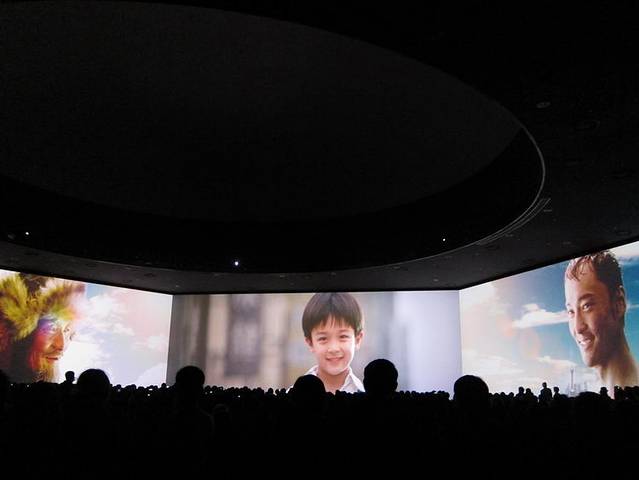 经过九曲十八弯的排队,终于上到最高一层,先进了一间环幕电影厅观看新中国的伟大成就~
