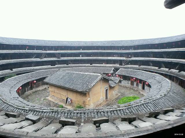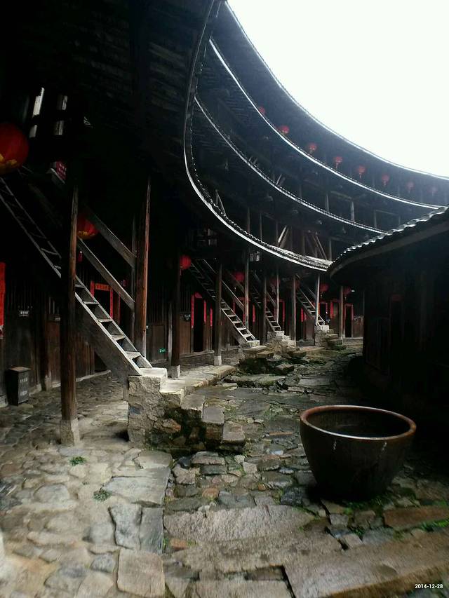 这土楼是当时的豪宅, 土楼一般一楼是厨房和饭厅, 二楼是粮仓,三楼以上是房间,所以每一户人家是上下结构的, 大多数土楼有4 5 条公共楼梯, 但这座土楼基本每户都有自己的私家楼梯, 所以说是豪宅了