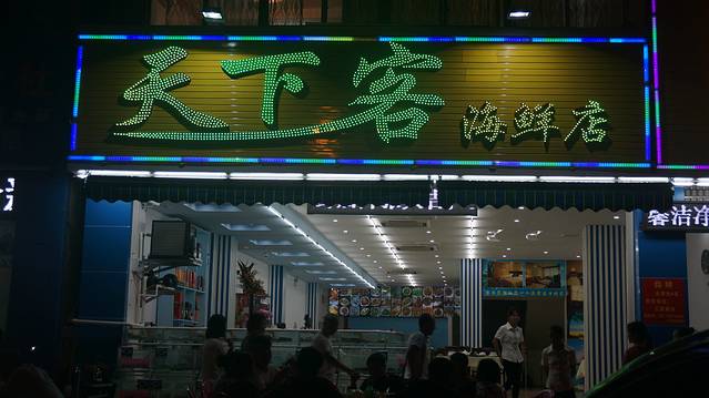 第一天晚上在三亚住的宾馆下就有海鲜大排档,但我目标不会改变,就是市内的春园路春园海鲜广场对面的天下客海鲜店,听之前在西岛同行的两位朋友说晚上在宾馆附近的海鲜大排档吃宵夜,只点了基围虾和两种螺就花了480元,真是感慨现在什么都不如人心黑.在突破了出租车司机种种“诱惑”来到天下客海鲜店 这是在网上做了功课后的选择,到了三亚就一定要吃海鲜,海螺号海鲜在三亚是很有名气的,网上对他的评论很好,老板姓钱原先是春园海鲜广场里5排6号,5排7号档主,个人认为他家还是一个不错的选择。