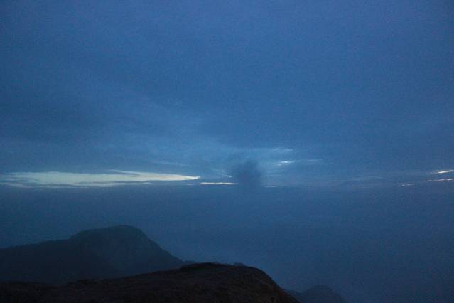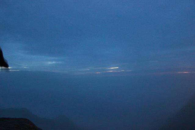 光芒时而从地平线越过,不一会,又回去,反复如此。估计它也想给我们呈现它的光芒,它的五彩缤纷,光芒还是没有敌过云雾,羞涩的回去了,只剩下直到冰蓝色映照着大多数人失落的眼神