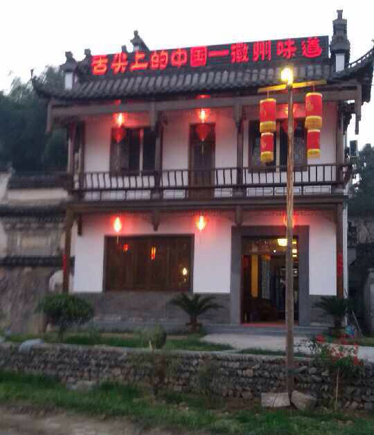 屋顶“舌尖上的中国徽州味道”很显眼,门口一个大广场,停车用,后面是古老的大树,青翠的大竹子,风光秀丽!