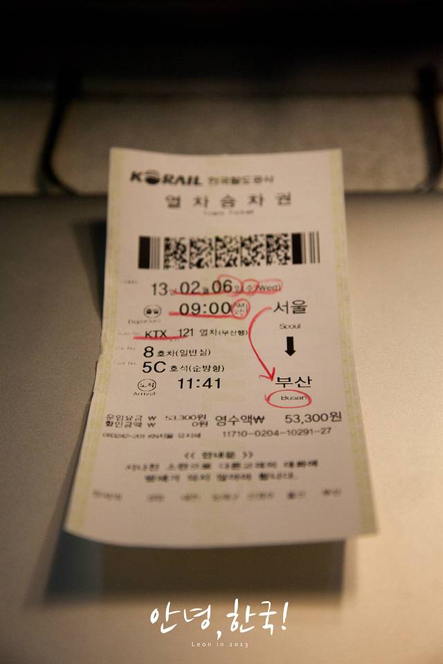 这就是KTX的车票,升价了53,300W,售票的因为英语也不太好,我韩语也很菜,