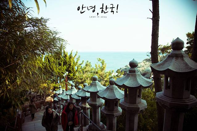 海东龙宫寺位于釜山东海岸,是韩国唯一一座位于海边的寺庙。始建于1376年,依山傍海,内有海水观音,大雄殿,龙王堂,四狮子三层石塔等景观。龙宫寺最特别的景点是108阶和日出岩。从龙宫寺入库必须下108阶才能来到寺庙,而日出岩就位于108阶中间。站在岩石上可以聆听到海浪拍打石壁的声音,欣赏日出的壮观美景。每当新年,不少人都来到这里面对日出许下心愿。而农历4月时,龙宫寺入口樱花繁盛。到了释迦摩尼诞辰,寺庙被电灯装扮起来,呈现出幻想般的美丽夜景。