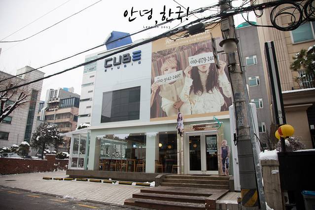JYP对面就是CUBE Entertainment 。上面是CUBE旗下的CAFE ,CAFE上面就是公司和练歌房。