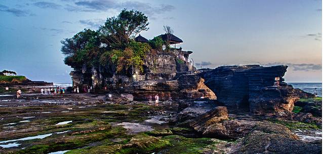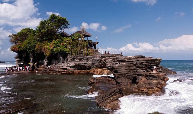 海神庙(Tanah Lot)海神庙是巴厘岛最重要的海边庙宇之一,始建于16世纪。该庙坐落在海边一块巨大的岩石上,每逢潮涨之时,岩石被海水包围,整座寺庙与陆地隔绝,孤零零地矗立在海水中;只在落潮时才与陆地相连。