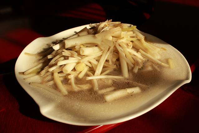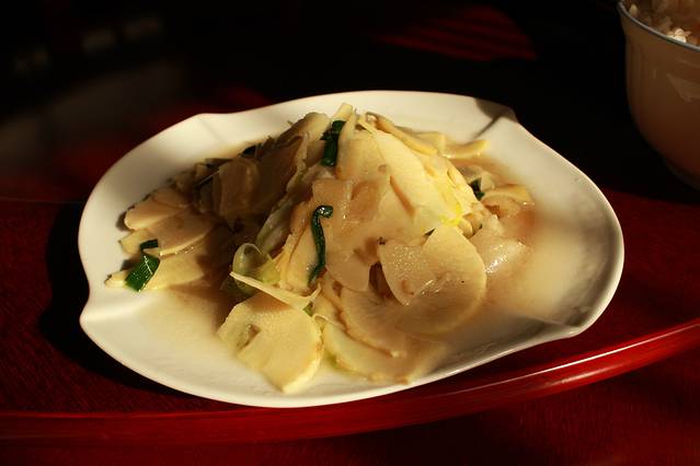 此时正值饭后,老板给了我一张打折卡,于是乎选择在山庄里面吃饭,老板安排了一个很大的包厢,吃饭的只有我和姐姐,完全是种土豪的感觉。点了2个溧阳本地的特色菜,味道很好,推荐:溧阳白芹.溧阳竹笋炒腊肉,其实还有一个特别的好吃的特色菜:溧阳鱼头,因为我们就2个人,实在吃不那么多,于是就没点这道菜。 人均消费40元/人。