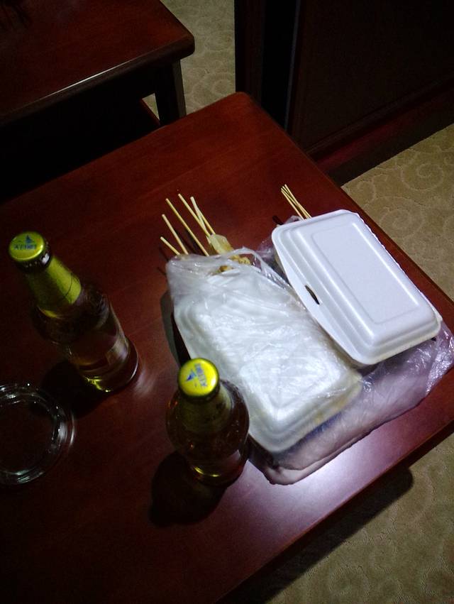 回去的时候已经晚上22:30分了,山庄的前台灯还是亮的,前台没有其他的,就属酒最多,拿了2瓶啤酒回房了。