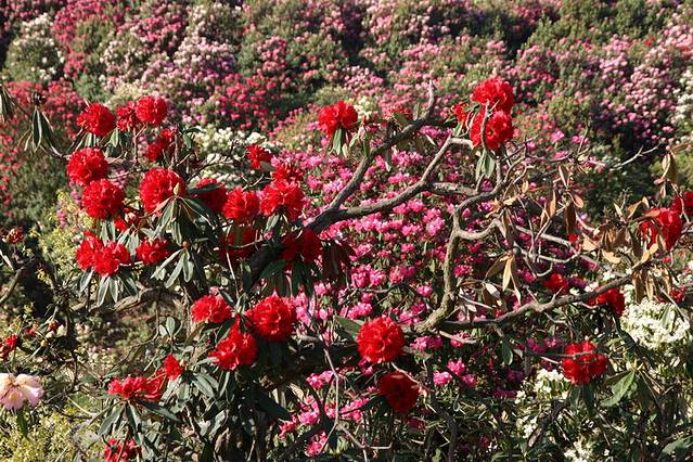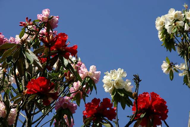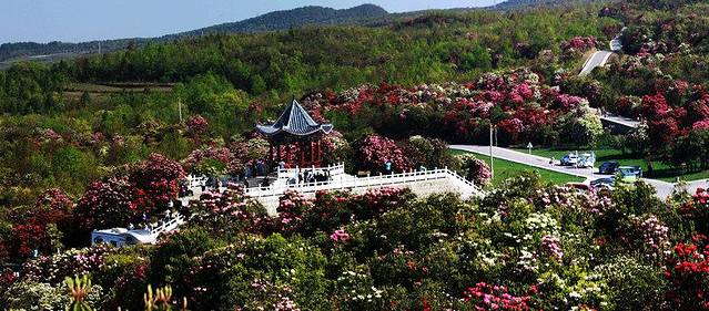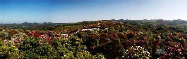 【百度百科】百里杜鹃位于贵州省大方、黔西县交界处,初步查明景区内有杜鹃41个品种,占世界5个亚属中的4 个,花色多样,有鲜红、粉红、紫色、金黄、淡黄、雪白、淡白、淡绿等。最为难得的是一树不同花,即一棵树上开出不同颜色的花朵,最多的达7 种之多,被誉为“世界上最大的天然花园”。有“地球的彩带、世界的花园”的美称。