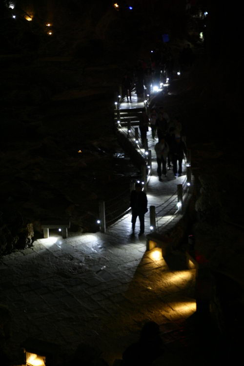 在洞里,可以看到随意丢弃的矿泉水瓶,有人在禁止触摸的警示牌前依然伸手去触碰这些岁月积累形成的珍迹,有人在禁止吸烟焦油有损石灰岩的警示牌下依然吞云吐雾,一群加塞的人依然振振有词地去指责另一群插队的人……
