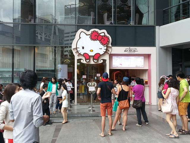 出街后跟着豆友妹子来到某个大厦的楼下,看到了“传说中很出名的hello kitty主题”的什么店,不哈这些所以...嗯...不很清楚...还是留个影吧,主要为了照周围的人群....