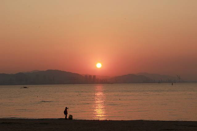 第一次听到海的声音,心蹦蹦的跳,终于看到期待那么久的海了。一天就沿着海边,慢悠悠的走,在沙滩上坐着,脱掉鞋子,和水痛痛快快的玩。潮涨潮落,水把脚下的沙子一点一点的带走,仿佛真的能感到时间在脚下流动的感觉。夕阳那么美,该怎么用语言描述呢?