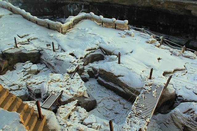 隆冬季节,龙槽冰封,两岸溢流形成的水柱如同大小不一的冰峰倒挂悬崖,彩虹时隐时现。