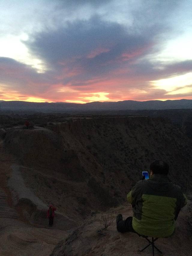 从统万城到波浪谷大约两个小时车程。晚上七点左右到了靖边县城。当地的驴友(驿站)很热情的接待了我们,帮忙安排了食宿,条件还不错,大家也都很满意。为了看波浪谷日出,友友们早早就起来了,到了观景台天还没亮。遗憾的是当天云特别多,等来了天亮却没欣赏到喷薄而出的太阳。每次旅行都留下点遗憾做纪念。百度了下,地质学上这里叫丹霞地貌,很美的名字。水上丹霞更胜一筹,连冰都是绿盈盈的。
