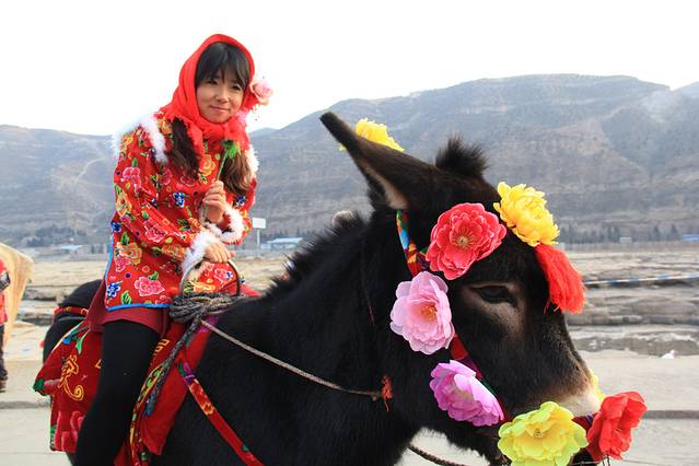 这头漂亮的驴,见到小花袄就猛点头,见到男的就猛摇头。也是醉了~走,驮着我去赶集!