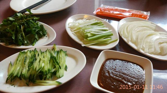 各种配菜和酱料,东北大葱真是太好吃了