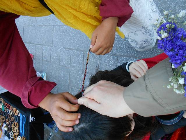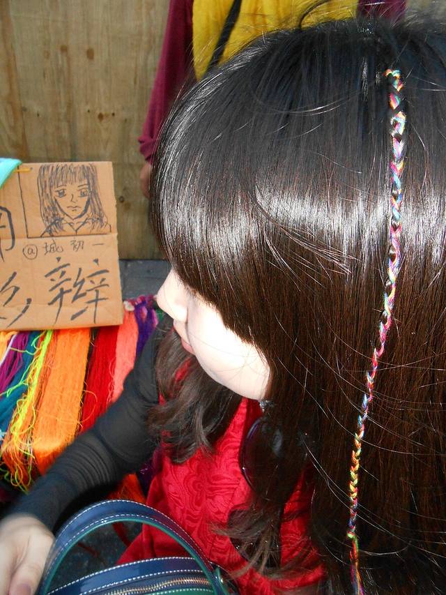 扎辫子的那个人手太有劲了,恨不得把姑娘的头发拔掉了,我只好抓着