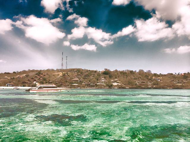 蓝梦岛在巴厘岛的东部,是一个非常小的岛屿,当天出海风向逆,加上快艇速度很快,所以有怕晕船的朋友可以提前准备好止吐袋或者晕船药,但是忍忍40分钟就能到也不是很长时间,如果你想提前体验下大海的感觉可以上船舱二层和舵手一起体验下乘风破浪的感觉。在离岛大概三四百米的地方,就能清澈的看到海底,所以别兴奋,深的地方有十多米,浅的地方一米都不到,别乱跳。