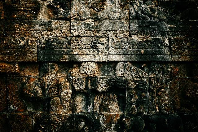 之后坐车折返一小段距离,到了婆罗浮屠,吃了很简单的Toasta加黄油的早餐就进庙了。寺庙比较大,由于印度教不允许穿裤子和露大腿,所以穿短裙短裤和裤子的朋友们会在寺庙门口免费领到一块围裙,围上就能进庙了。婆罗浮屠很大,适合远观,寺庙的浮雕上刻着奇奇怪怪的面孔,有的还挺吓人的。