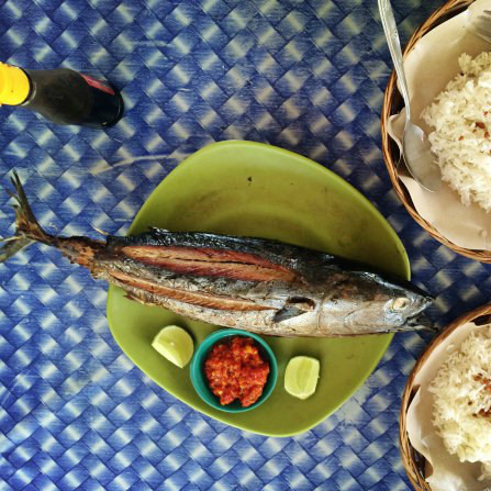 我们随意进了一家当地人的餐馆,价格相比于在海滩旁边的店要便宜得多,不过点餐也成了个问题,老板的女儿拎出来一条烤的干干的鱼,问我们要不要,想想这应该就是所谓的特色了吧。我们于是同意来一条,这鱼味道很好,但是内脏部分有些腥味。