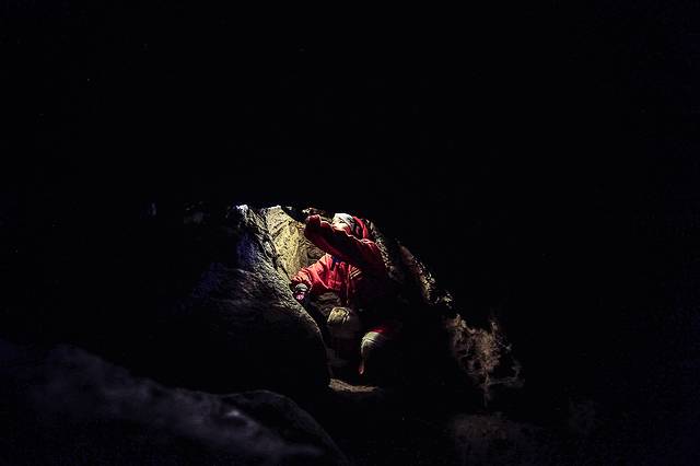 洞腔远比前次的狭窄,基本上没有开阔地带,空高也非常低,于是背着大包器材的我不得不时而半蹲,时而匍匐前进,还得小时翼翼的保护镜头不被岩石刮损。