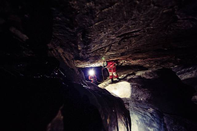 我于先锋之后第二个下降,由于需要仰角机位拍摄,干脆就借地势整个人躺仰在洞壁上,挨着给每个下降的队员进行拍摄。