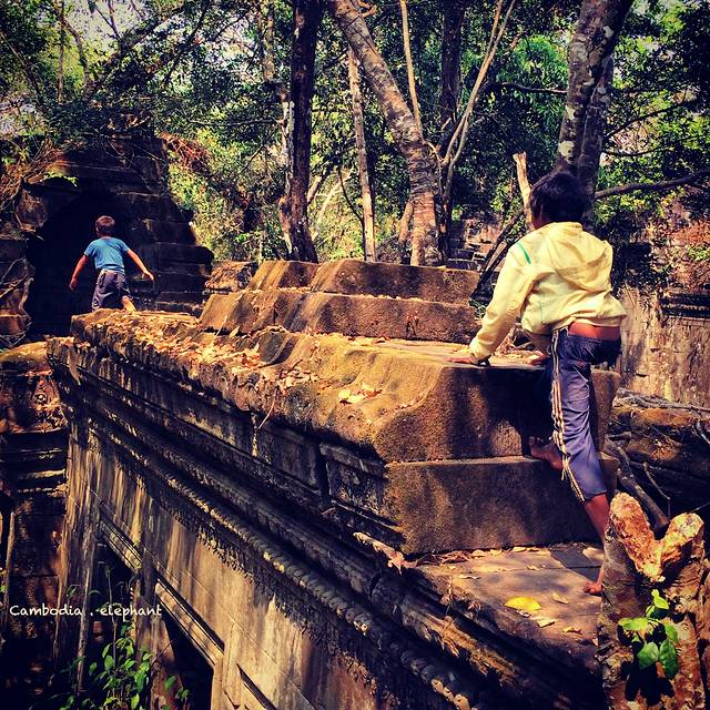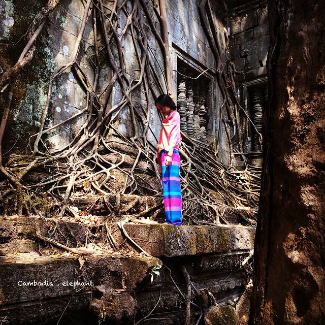 在很多地方也有遇到很多人说的会涌上来向游客要钱的小孩子,他们真的会不厌其烦的缠着你,刚开始我真的是被他们弄得很烦躁,因为他们就一直跟着,而且是一堆小孩,当我一停下来,他们就全部伸出手来。后来有一次,忘了是在吴哥的哪个寺,也是一进去,就一堆小朋友围上来,他们很聪明,一眼就看出我们是中国人,一直在那里“你好,你好”的说着,然后伸手要钱,我们经历过几次后,知道只有给钱才能打发他们,就准备拿零钱给他们,这时他们中一个小男孩看到了我手上拿着一罐1升的豆奶,突然羞涩的用手指了指牛奶,我用英语问他是不是想要这个,他说yes,于是我把那罐豆奶给他了,他喝了一口,就递给其他的小伙伴,其他人也是每人一口就递给下一个人,而且他们一个劲的用蹩脚的中文对我们说“谢谢”。我突然就被他们这个“分享”的行为感动的一塌糊涂,立马把包包翻了个遍,把所有能吃能喝的东西全部给他们了,他们超级开心的蹦蹦跳跳,像是捡到什么宝贝一样。