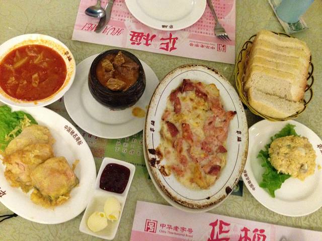 华梅西餐厅:烤奶汁杂拌40元,红菜汤14元、俄式沙拉24元,软炸马哈鱼,面包(红菜汤偏酸,味道一般;马哈鱼,怕腥的人不要点)
