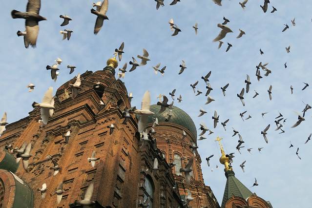 圣索菲亚大教堂上空飞过的鸽子,这里鸽子完全不怕人