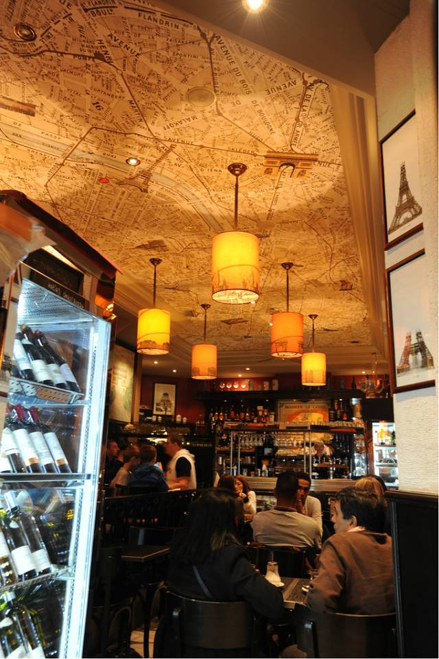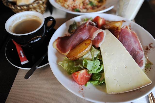 为了等夜色全暗,索性先把晚饭解决了,法国人的晚餐时间也是8点左右,所以正是cafe和餐馆最热闹的时间~我记得第一顿我点的三明治,结果上来的是半根法棍夹着巨大一块的奶酪和腌肉。。。把我吓屎了!!阿能来之前就一直啰嗦欧洲的面包多难吃,唯有吃羊角度日,其实我还蛮喜欢法棍的,虽然硬硬的不过很有嚼劲越嚼越香~<<<<再嚼你的两块咬合肌会越来越大的傻妞哈哈哈哈哈一口一