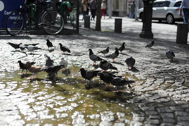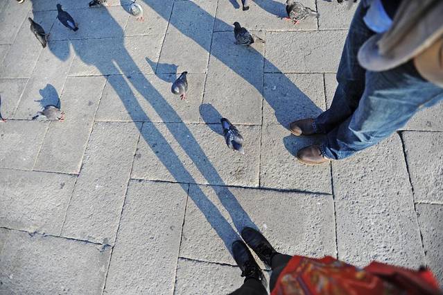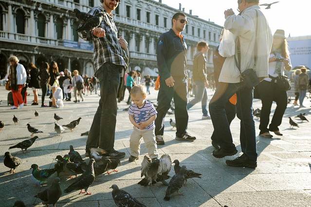 可爱的孩子们追着鸽子跑,鸽子们蜂拥着手拿食物的游客,夕阳西下,没有比这儿再温暖的场景了