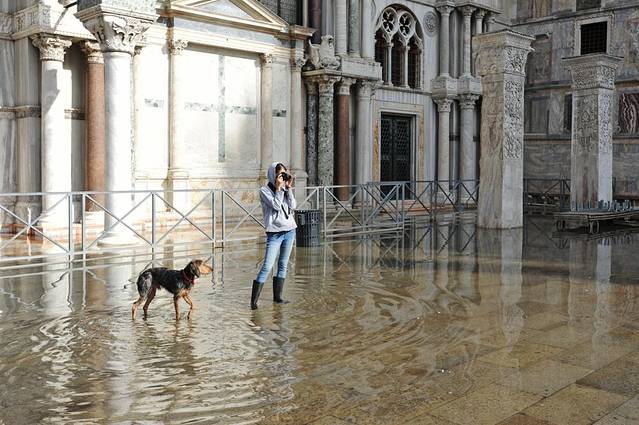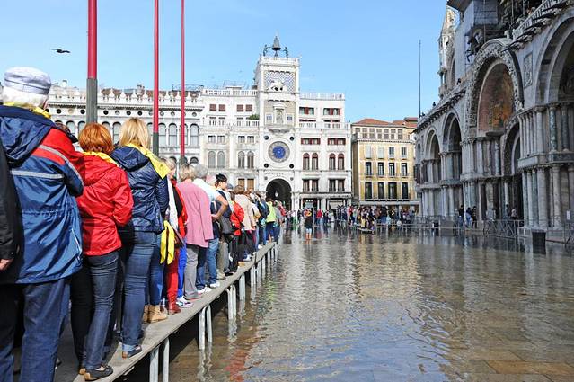 在刚来到威尼斯的时候,我们发现这里水位非常高,许多建筑的第一层阶梯已经淹没在水里,眼看着水就要涌进去门缝了,来到广场果不其然,广场的一半几乎也是浸泡在水里的,进入圣马可教堂更是需要踩着高高架起的临时步道才能缓慢通行