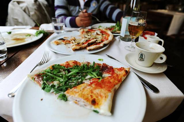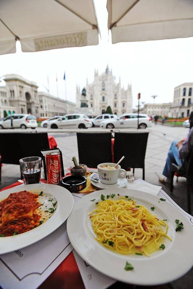 在正对大教堂的餐馆用餐,意大利的食物比法国瑞士好吃太多了