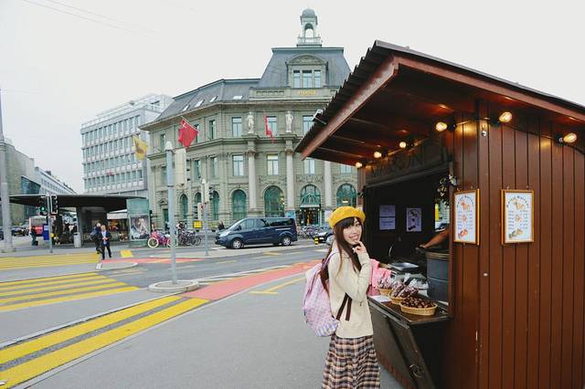 走在老城区的街道上,交错在红色的有轨电车中,街道由圆石铺就,两旁的拱廊是各色甜品和品牌店。街心是充满中世纪奇幻色彩的彩柱喷泉