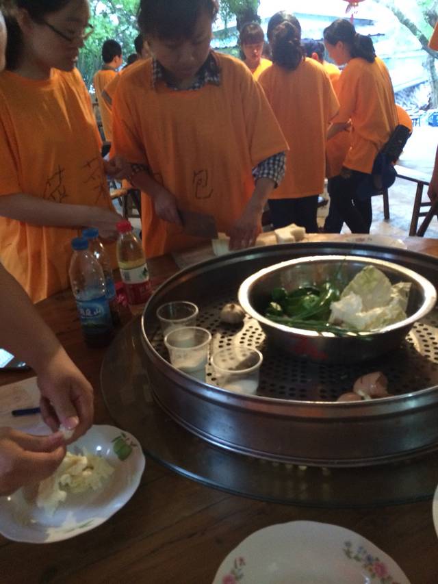 下午是出去盲行,只有一队里的前后两名队友是可以看得见的,我们为了可以顺利通行想了很多办法,最后决定有一个台阶就拍一下后面队员的肩膀,两个就拍两下,向上就拍肩膀,向下就拍腿,事实上证明我们的办法是可行的。教练带我们走的是很难想象的山路,就是睁着眼睛都要很小心走的路,但是我们却一个不拉的都到了半山腰,花了正常走路两倍的时间。到了山上教练给了我们一张纸让我们上山去寻找晚上做饭的工具,火源,柴火等在一个半小时内回到住所!可苦了我们了,满山窜啊,终于我们队在最后五分钟内都赶回去了,而另外两个队则要想拿到做饭工具就用俯卧撑来罚罗,晚上我们的晚餐是我们用教练准备好的素材自己做的,还给每桌菜都做了一个主题,在我们的分工下,晚饭如火如荼的做起来了,我们做的是世界杯的主题,一桌的⚽️啊!