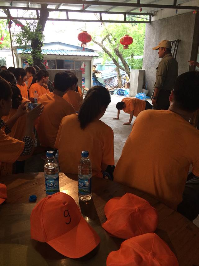 到达岛上我们由教练带队行走去农家,一路上好多当地人都在沿途卖土特产,最为吸引的是枇杷。走了好久以为要到了结果教练喊停原来是叫我们到操场分组,我们一共三十九个人分了三队,教练给了我们二十分钟组队形,起对名,队歌,对号,还让我们彼此在队服上画上与我们名字相符的图!我们队起了海啸队,队歌,狼烟起,江山北望,堂堂中国要让四方来贺!向其他两队掀起了挑战,进入到农家已经接近十二点,农家饭菜已经准备好,吃过午饭分房间,拿了房间钥匙就上去休整一个小时,一点半集合!