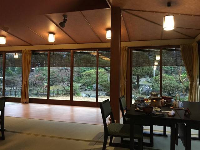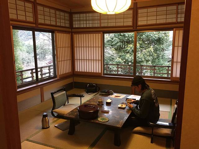 记得浴衣是左搭右,反了的话是有丧事才那么穿的。泡温泉是要先洗好澡再全裸进去的,长头发和小毛巾都不能泡水里。晚饭是泡完温泉直接在房间吃,小两口的话就推荐“蓬莱”房,外面冰冷冷的开着暖气看着大玻璃窗的园林静喝冰冻的梅子酒,你们就自行想象吧~