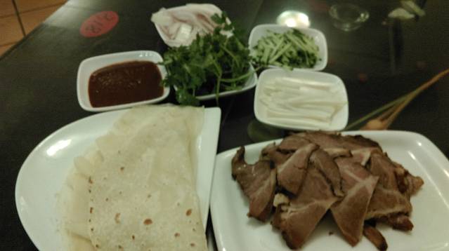 一个是因为我饿了,再一个是网上推荐了他家好多好吃的菜品,哪个都想点,最后准备要一个熏肉,一份京酱肉丝,结果服务员对我说,你一个人吃不完,建议我要一个菜就够吃的了。。。晕,最后点了一份熏肉(30元),然后2份春饼,2份筋饼(一份2片,2元一份)1份配菜套餐(8元)。春饼很好吃,筋饼确实很筋道,但个人来讲不喜欢。菜量听足,我算是个很能吃的女汉子了,到最后熏肉还剩一半,扔掉可惜,我就打包了(又要了2份春饼,是不是很过日子,哈哈)---这份打包的熏肉最后还真的派上了用场