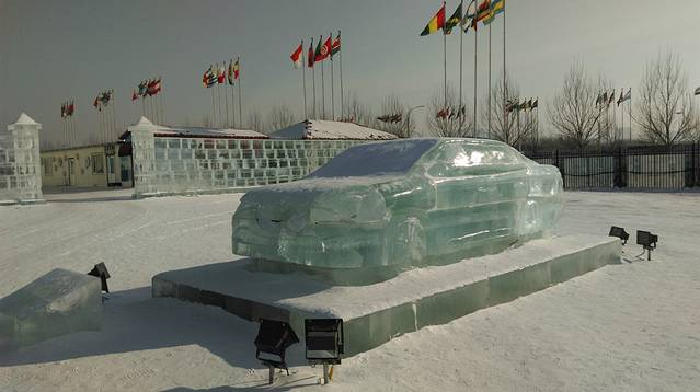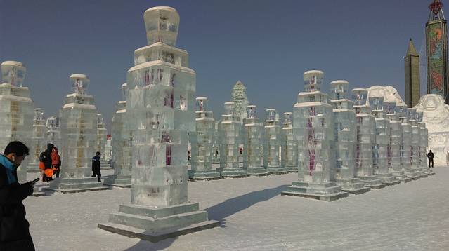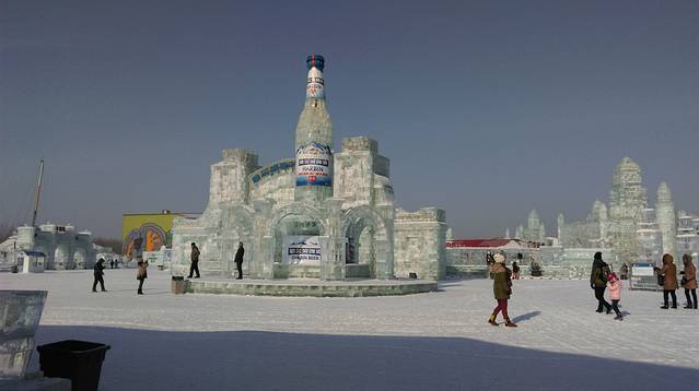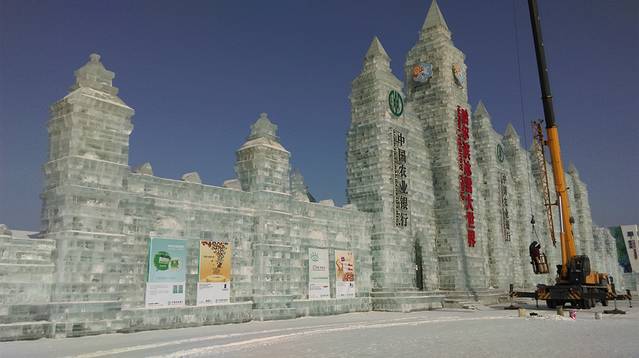 前两天太累了,早上醒来的时候已经8点半了,本来的行程打算是早上逛索菲亚教堂和中央大街,下午或晚上去冰雪大世界!但是大街和教堂昨天已经去过了,要不……白天去?!(事后回想,当时真是做了这个很明智的决定!一是省下了200多块钱的门票钱;二是白天的感觉和晚上是不一样的,更美的无与伦比。)做好决定后,就马上到淘宝订门票,11点前进园85元(比官方便宜一半,比晚上便宜200块,偷笑吧)!立马行动!洗漱好穿好所有的行头,更主要的是全身上下贴了6片暖宝宝 出发!出门马路对面坐13路区间车1块钱,30分钟后就跨过松花江到达目的地,大约走了10分钟,冰雪大世界的牌子就在眼前了!